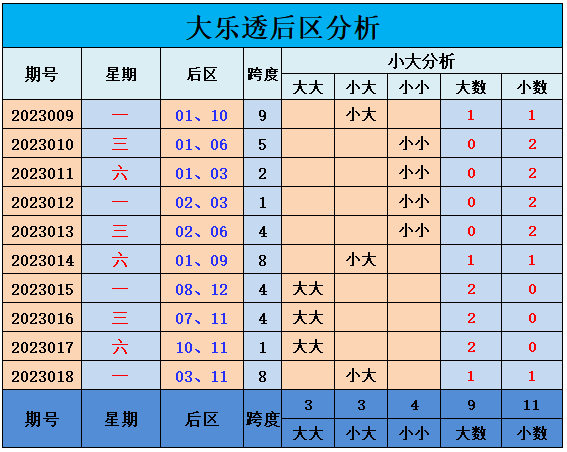 最近10期后区大小比为9:11,最近10期后区大大组合开出3期,小大组合开出3期,小小组合开出4期。上期开出小大组合,本期看好小大组合出现。