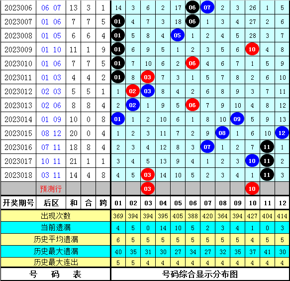 二、后区预测:后区上期开出号码03、11,为温码+重号,目下后区遗漏值4以内的热码有8个:01、03、07、08、09、10、11、12;遗漏值5-11之间的温码有3个:02、05、06;遗漏值12以上的冷码有1个:04、本期看好出现重号,和顺两码03、10。
