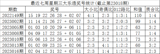 后分袂析:最近7周星期三全大出现1期,全小出现3期,一大一小出现3期;全偶出现1期,一奇一偶出现4期,全奇出现2期,本期后区两码参考06和07。